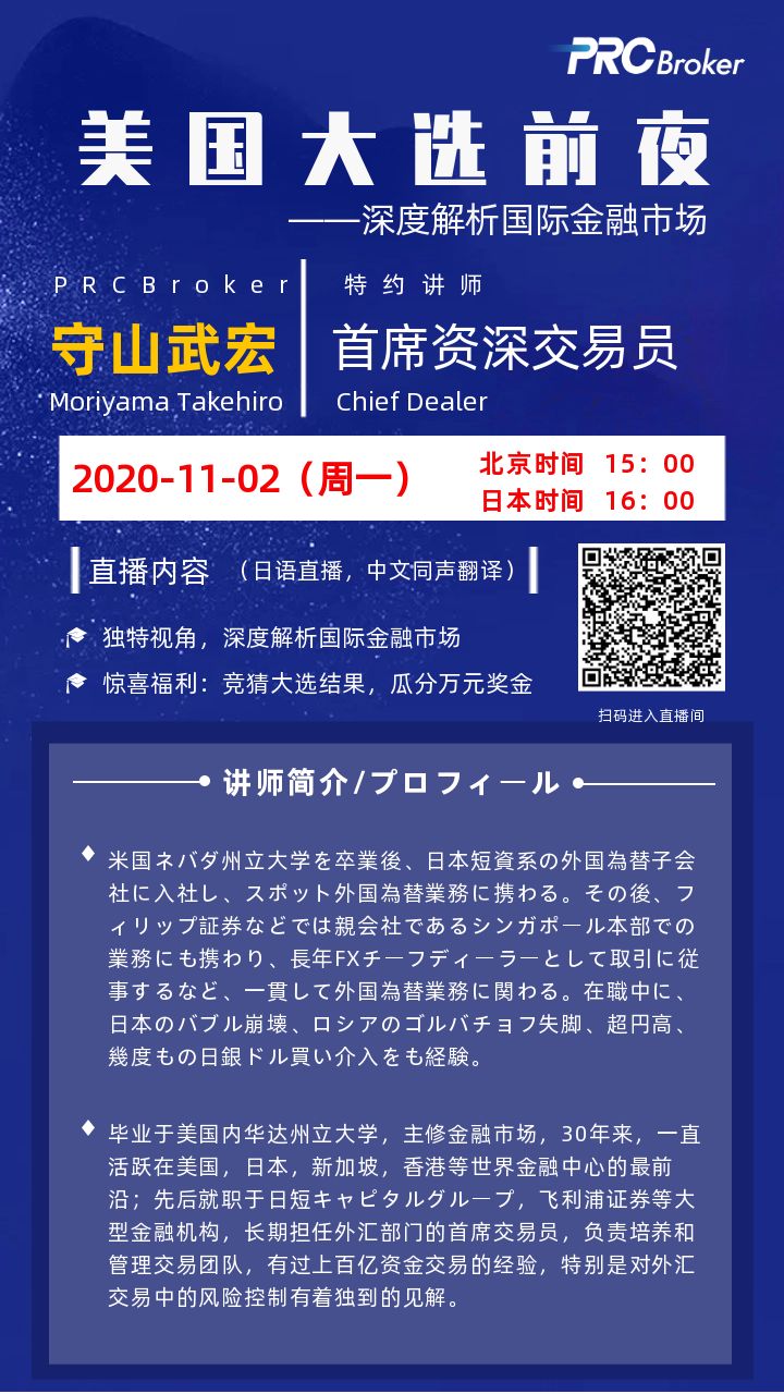 | 2020/11/02 | 星期一 | 15:00 | 美国大选前夜–深度解析国际金融市场 | 守山武宏 |